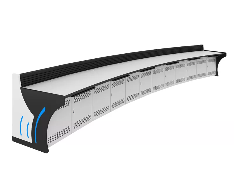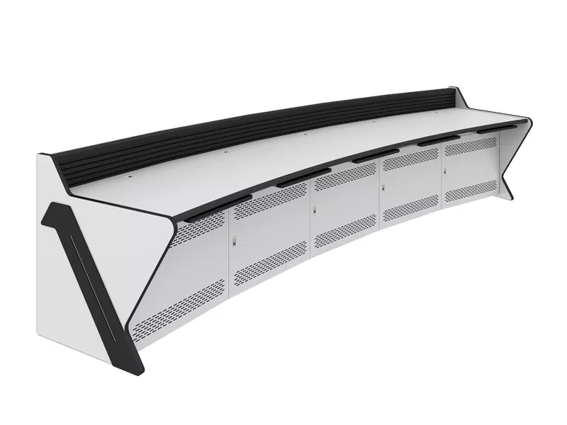 1. Diseño curvo ergonómico para una operación más fácil: la mesa curva se adapta al flujo visual y operativo, lo que permite a los operadores monitorear fácilmente múltiples pantallas sin girar con frecuencia, lo que reduce significativamente la fatiga del cuello, los hombros y la espalda debido a turnos largos y mejora la eficiencia del monitoreo.
