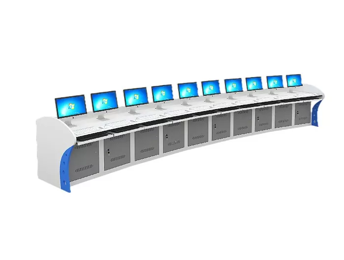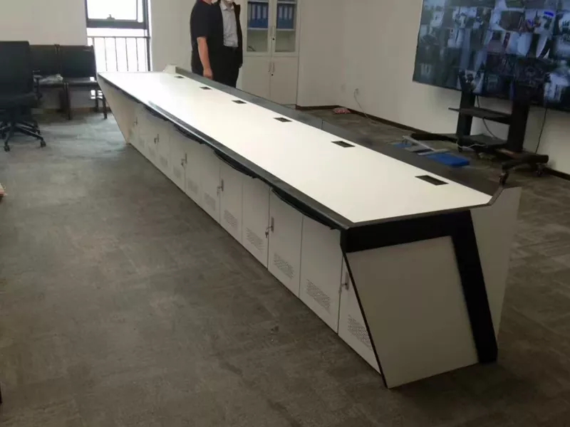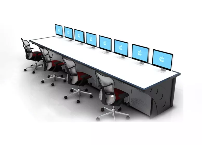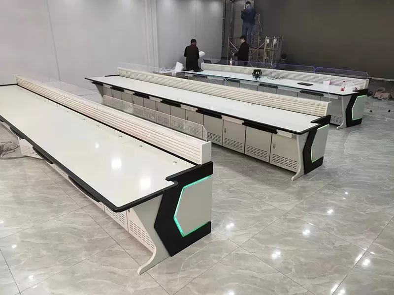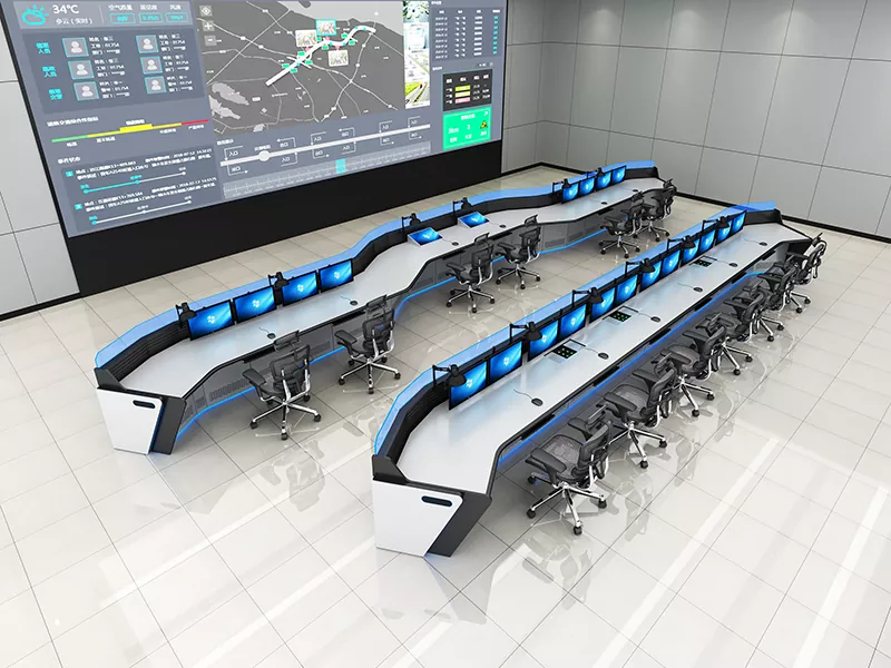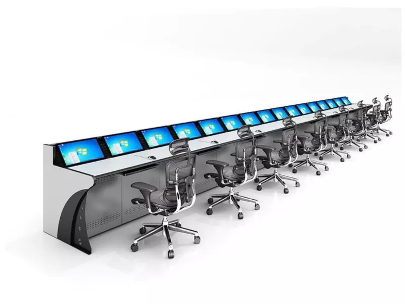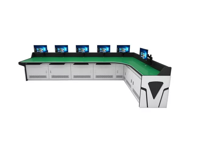 La consola de monitoreo modular integra bandejas de cables ocultas y canales de cableado organizados para reducir el desorden y simplificar el mantenimiento. La altura de trabajo ajustable y las superficies de escritorio resistentes al desgaste mejoran la comodidad del operador durante turnos largos.
